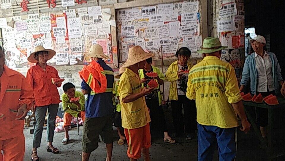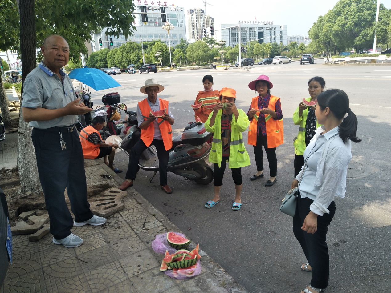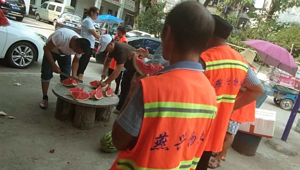 午后正是最熱的時(shí)候,為緩解高溫給環(huán)衛(wèi)工人帶來的不適,8月1日,江西燕興物業(yè)管理有限公司鷹潭分公司黨支部組織黨員和公司骨干、管理員,為環(huán)衛(wèi)工人送上清涼的西瓜解暑降溫。 他們讓工人在最熱的時(shí)間,集中到一起休息,把西瓜遞到每個(gè)工人手上,并對(duì)每一位工人道聲“辛苦了”。一位環(huán)衛(wèi)工人邊吃西瓜邊說:“謝謝你們!我們習(xí)慣了,再苦的工作也得有人做呀,不然城市環(huán)境怎么辦?”。樸實(shí)無華的回答,顯示出了環(huán)衛(wèi)工人的那份責(zé)任心。